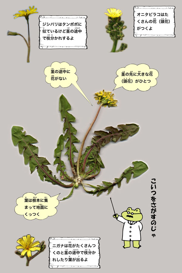 葉に固い毛が多いのでザラザラしているのと、茎の途中でわかれて花をつけますのでタンポポと見分けることができます。